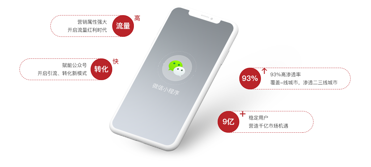 小程序是一種不需要下載安裝即可使用的應用,它實現了應用"觸手可及”的夢想,用戶掃- -掃或者搜一下即可打開應用 。也體現了“用完即走”的理念,小程序能夠實現消 息通知、線下掃碼、公眾號關聯等七大功能,小程序是4年內移動互聯網商機,率先上線小程序,搶占流量紅利, 實現營收激增!